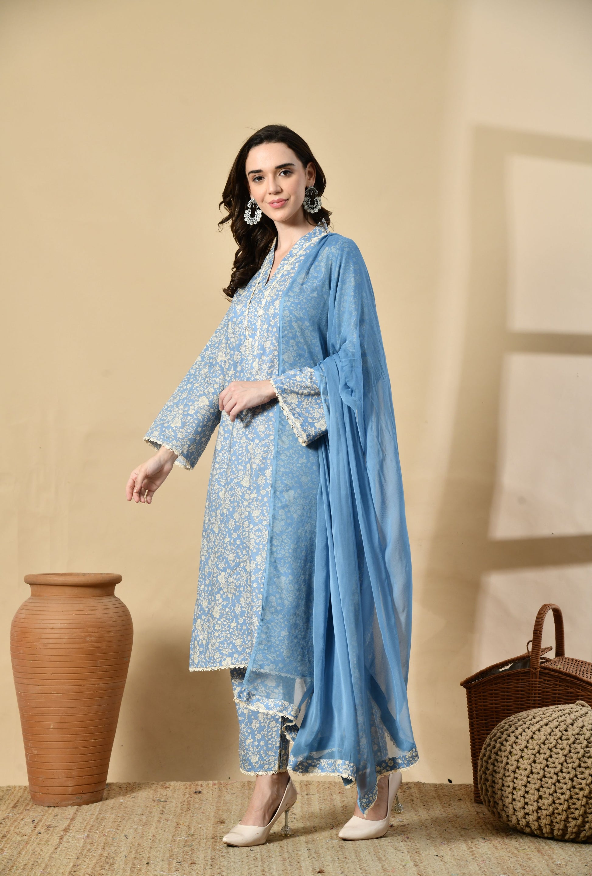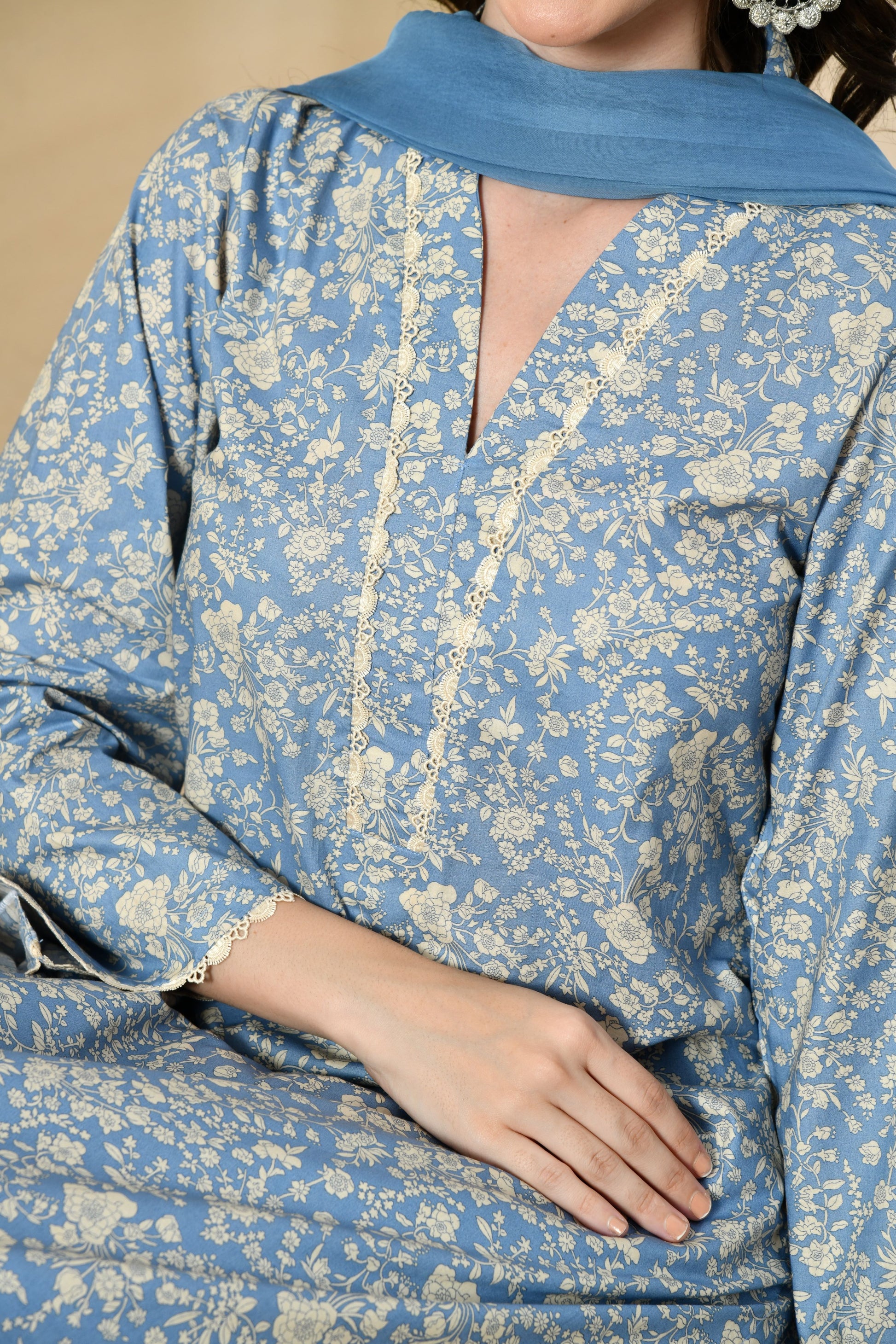 Elegant and easy to wear, the Floral Blue Detailed Suit features a soothing blue floral print on soft cotton, enhanced with fine detailing on the neckline and sleeves. The matching pants are thoughtfully finished with coordinated accents, and a lightweight chiffon dupatta completes the look.
