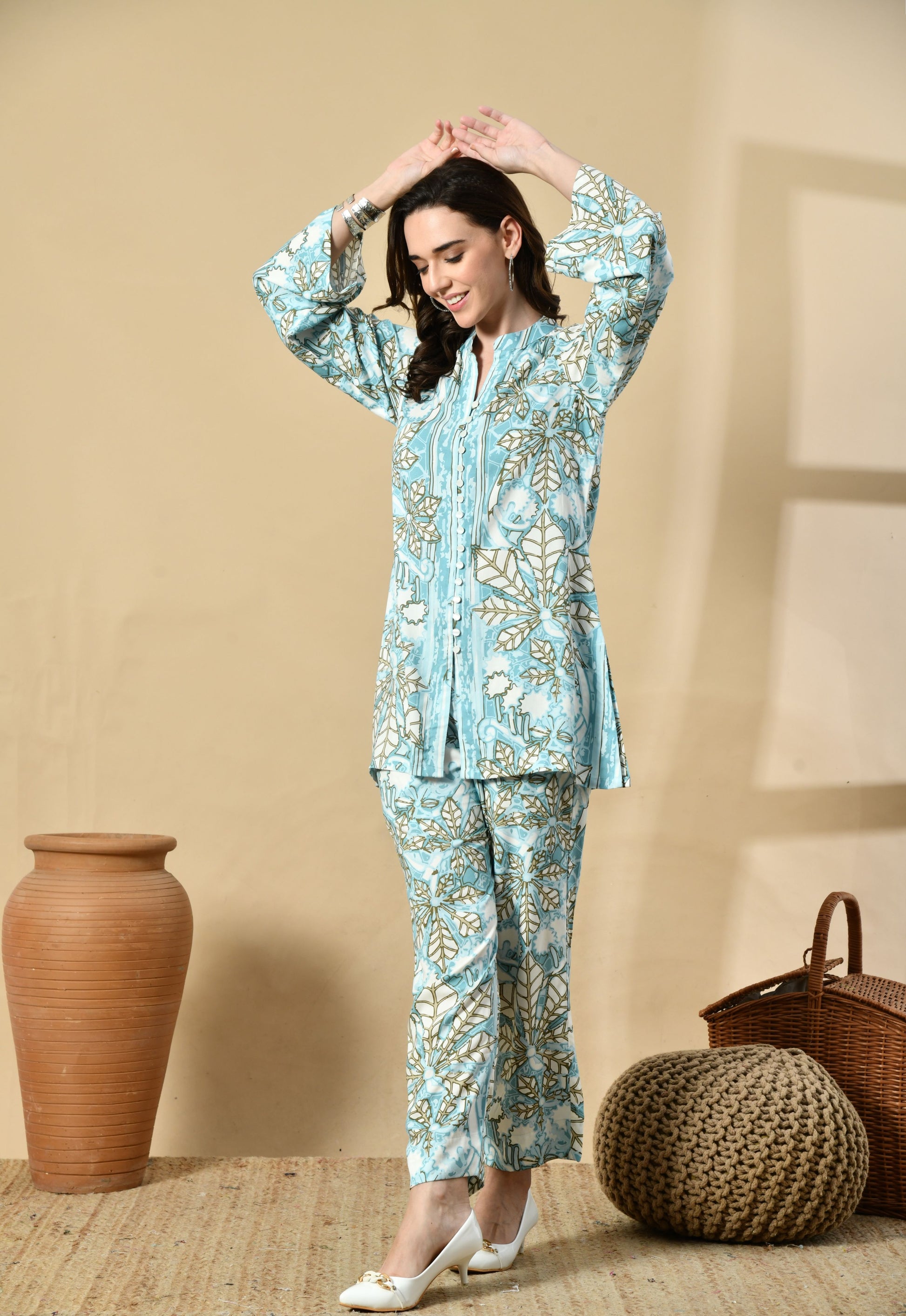 A perfect blend of comfort and simplicity, the Blue Horizon Co-ord features a soft blue print with stylish button detailing down the front. Crafted from breathable rayon fabric this set offers a relaxed fit that’s ideal for casual days.