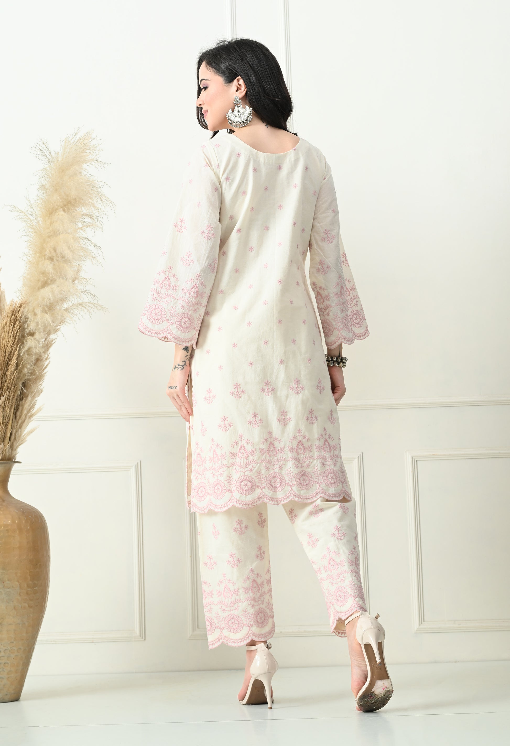 A graceful ivory co-ord set featuring a beautifully detailed neckline and intricately embroidered pants. Designed in soft fabric with a comfortable fit, this outfit is the perfect blend of sophistication and ease for both casual and semi-formal occasions.