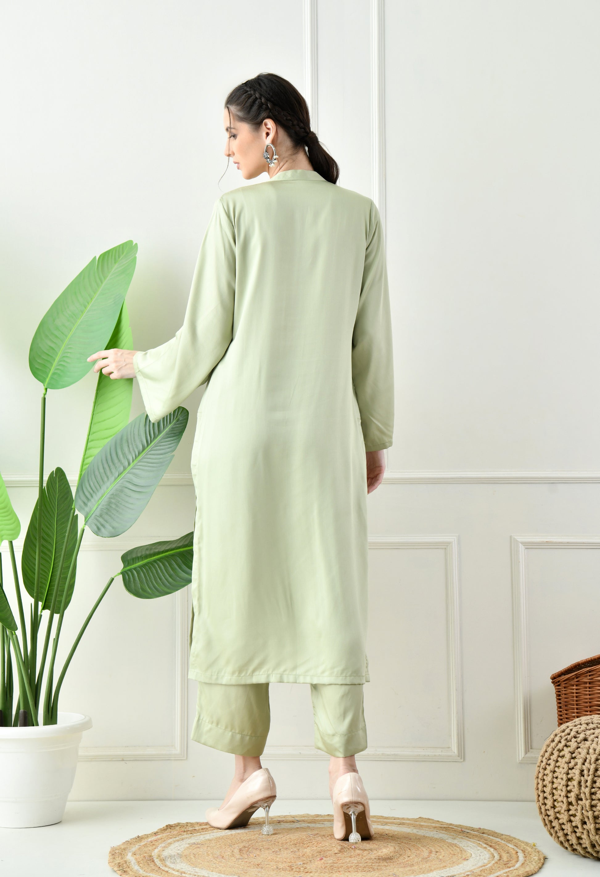 Soft, flowy, and easy to wear — this pista green co-ord set is made in breathable modal fabric. Designed for all-day comfort, it features subtle detailing and matching pants for a coordinated, minimal look.